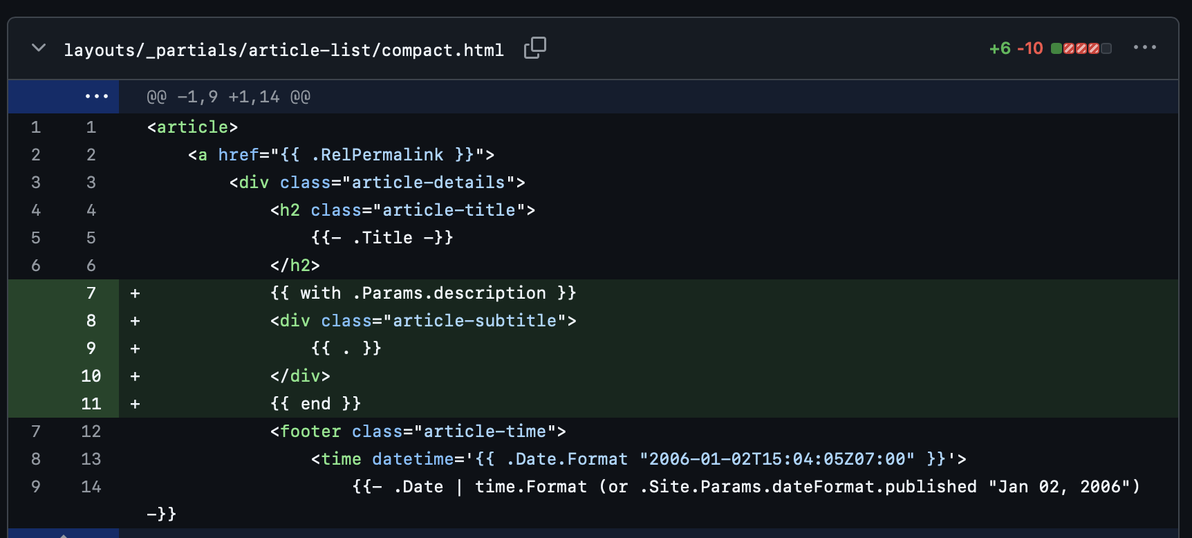 在layouts/_partials/article-list/compact.html里添加代码时,只需要添加这部分代码到article-title的之后。