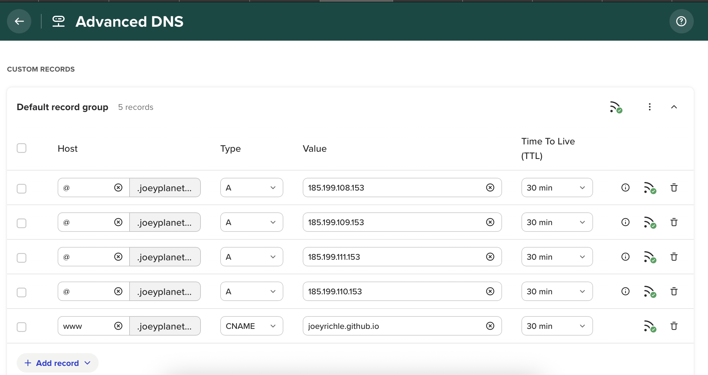 回到购买域名的网站,配置DNS。 spaceship是在Launchpad,找到Advanced DNS,按照GitHub docs的说明 ,添加4个A record和1个CNAME record。A record的Host处填入一个@即可。添加完保存后,等待链接成功,会需要一点时间。